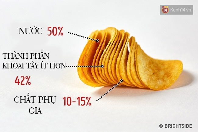 Nhưng bạn có hay, khoai tây không phải là thành phần chủ đạo của món snack khoai tây này. Các nhà sản xuất còn sử dụng bột khoai tây (bột mỳ hoặc ngô) và hỗn hợp tinh bột cho sản phẩm của mình với liều lượng vừa đủ để tăng hương vị.