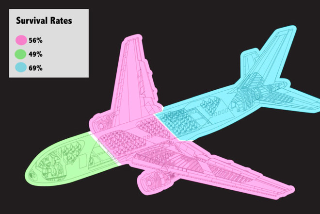 Khả năng sống sót của những hành khách ngồi gần đuôi máy bay trong một vụ tai nạn cao hơn nhiều so với người ngồi phía trước. Cụ thể, ghế ở khu vực đằng sau máy bay, phía sau gờ cánh máy bay có 69% khả năng sống sót. Trong khi đó, tỷ lệ này ở ghế ngồi ngang cánh và giữa khoang là 56%. Khu vực phía đầu máy bay chiếm 15% tổng số ghế có 49% khả năng sống sót.