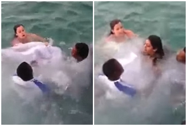 Ngay lập tức, một vài người bạn khác đã nhảy vội xuống biển nhằm giúp đỡ chàng trai giải cứu vợ mới cưới. Dẫu không gặp thương tổn đáng kể gì nhưng chắc chắn cô gái này sẽ vô cùng hối hận trước "sáng kiến" bất thành mà bản thân khởi xướng.