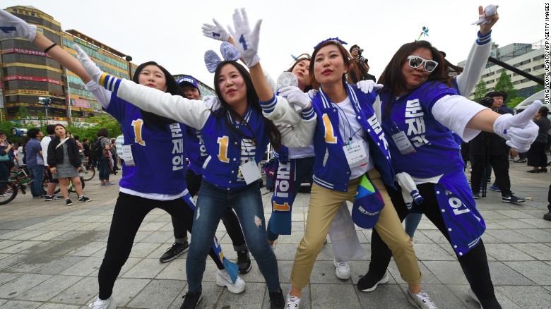 Người ủng hộ tự lập thành nhóm, mặc đồng phục có màu đại diện cho ứng viên của mình. Trong các sự kiện như tranh luận trên truyền hình hay vận động cử tri, nhóm ủng hộ sẽ lập sân khấu di động ở khu vực gần đó, nhảy theo những bài hát nổi tiếng của K-pop, với phần lời được sửa để thêm tên ứng viên vào. "Nếu chúng tôi nhảy nhiều hơn, ông Hong Jun-pyo sẽ mạnh mẽ hơn", Choi Wan-hee, một vũ công 21 tuổi, vui vẻ nói.