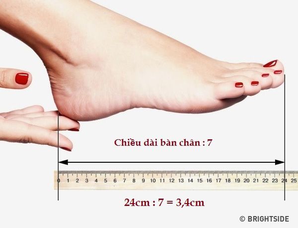 Ví dụ chiều dài bàn chân của bạn là 24cm, lấy con số này chia cho 7, vậy kết quả là 3,4cm. Nghĩa là, đôi giày bạn chọn chỉ nên có gót cao khoảng 3,4cm mà thôi.