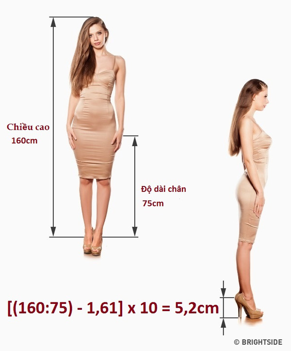VÍ dụ chiều cao của bạn là 160cm, chiều dài chân là 75cm, bạn sẽ có phép tính: [(160:75) – 1,61]x10 = 5,2cm. Vậy suy ra, giày cao gót cho bạn nên có chiều cao là 5,2cm.
