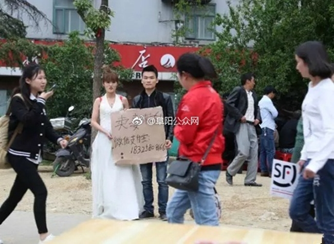 Buổi sáng ngày 8/5, người dân sống quanh khu vực trung tâm thương mại Bách Đại, ở thành phố Hợp Phì, tình An Huy, Trung Quốc đã được phen xôn xao khi chứng kiến cảnh tượng một người đàn ông cầm tấm biển "bán vợ cứu con" đứng ngay giữa đường, bên cạnh anh ta là cô gái trẻ đang mặc váy cô dâu.