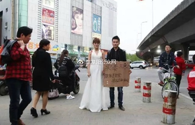 Vietbf.com - Một cặp vợ chồng trẻ Trung Quốc tìm cách kiếm tiền cứu con gái mắc bệnh hiểm nghèo, khiến người chồng cầm biển giơ cao rao "bán vợ cứu con" ở bên cạnh vợ, trong khi người vợ trẻ mặc váy cô dâu đứng giữa đường, làm nhiều người không khỏi bất ngờ.