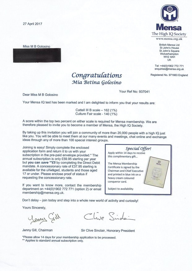 Để phản đối quyết định này, cha mẹ Mia đã đăng ký cho con gái làm bài kiểm tra IQ của tổ chức dành cho những người thông minh nhất tại Anh quốc – British Mensa. Sau đó, thứ họ nhận về là thư mời tham gia vào cộng đồng Mensa nước Anh.