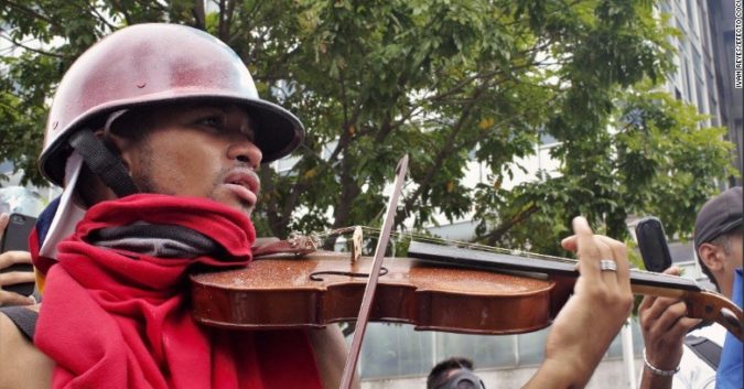 Người dân Venezuela tập trung trên đường phố để biểu tình trong suốt nhiều tuần qua. Nhưng cuộc biểu tình ngày 8/5 có điều khác biệt. Giữa đám đông hỗn loạn, những cột khói bốc lên và đạn hơi cay bay khắp nơi, có tiếng nhạc vĩ cầm vang lên.