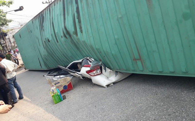 Do chở hàng nặng chiếc container đã bị lật nghiêng đè lên xe con nhãn hiệu Toyota Yaris khiến hai người ngồi trong xe tử vong.