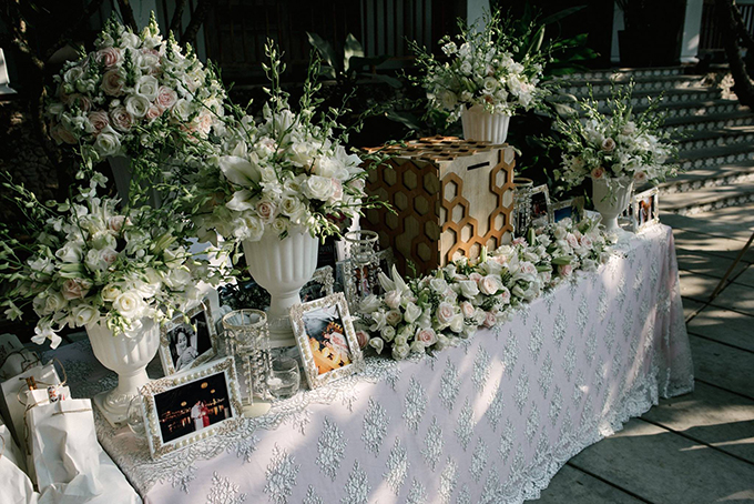 Với mong muốn có một buổi tiệc đơn giản, thanh lịch, ấm cúng, chú rể đã lựa chọn hoa lan, hoa ly và hoa hồng tone trắng để trang trí cho ngày trọng đại.