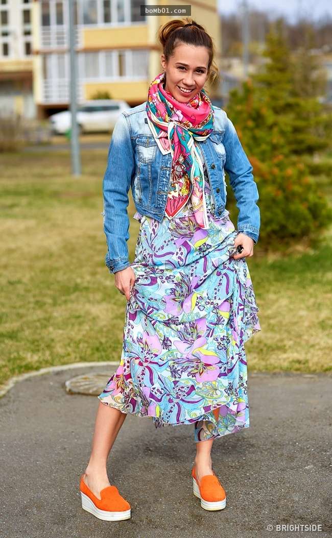 ▼ Ngày thứ Ba, chồng Caitlyn rất thích màu sắc tươi sáng. Dự báo rằng hôm nay thời tiết rất đẹp, do đó anh muốn vợ mặc đồ rực rỡ hơn một chút. Trong tủ quần áo của Caitlyn có một túi lớn của quần áo cũ, cô cất chúng đi vì nghĩ rằng mặc vào trông rất trẻ con, không ngờ chồng cô lại rất thích. Bộ cánh này lấy ra từ đống quần áo cũ.