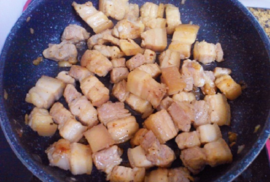 – Cho thịt vào nồi xào sơ qua để thịt sém vàng và ra bớt mỡ. Cho tiếp gừng, hành lá, tỏi vào xào thơm rồi thêm đường vào đun cho đường ngả màu cánh gián.