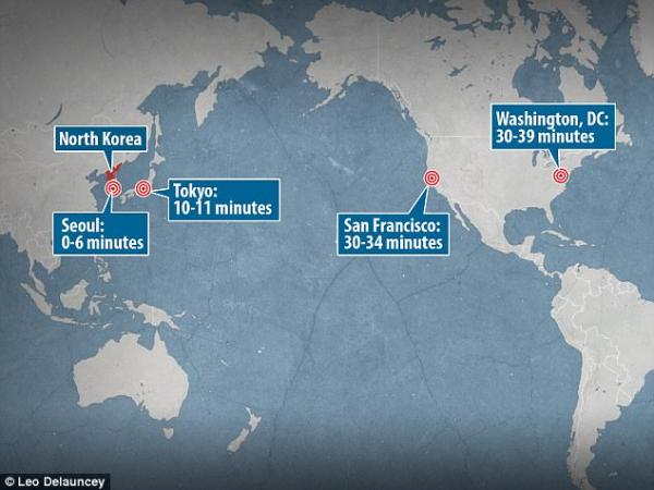 Đồ họa thời gian từ khi Triều Tiên tấn công phủ đầu đến thời điểm tên lửa đến đích. Seoul thủ đô của Hàn Quốc và Tokyo thủ đô Nhật Bản gần như không có thời gian để phòng vệ. Thủ đô Washington của Mỹ cũng chỉ có 10 phút để chuẩn bị khi tên lửa Triều Tiên chỉ mất từ 30-39 phút để tấn công thành phố này