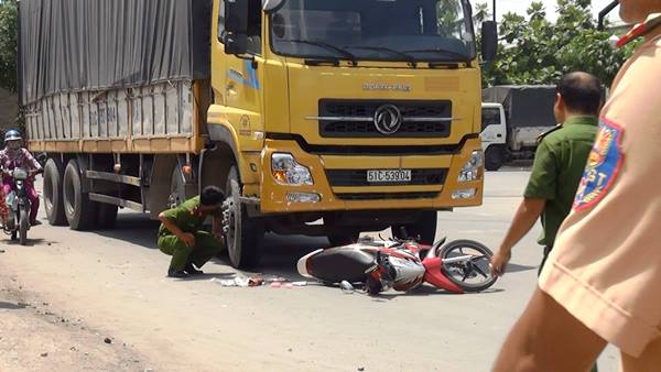 Lực tông mạnh khiến đôi vợ chồng cùng chiếc xe máy bị kẹt dưới gầm trước đầu xe tải và bị đẩy đi một đoạn gần 20 mét mới dừng lại.