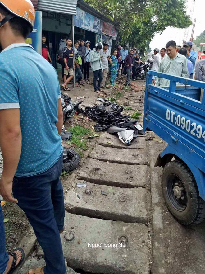 Hình ảnh chiếc xe máy bị nghiền nát sau pha va chạm.