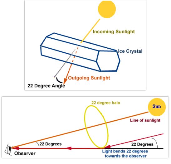 Khi thời tiết rất khô, ít hơi nước, trên tầng cao khí quyển xuất hiện màn mây trong và trắng nhạt, dạng tơ sợi tơ (hoặc như tóc, có khi nhẵn lì) che cả bầu trời hay một phần, loại mây này có cấu trúc do vô vàn những tinh thể băng nhỏ (ice crystal) gọi là Mây ti tầng (tiếng Latin: “Cirrostratus”, viết tắt là Cs). Ánh sáng từ Mặt trời khi đi vào khí quyền xuyên qua các tinh thể băng có dạng lục giác này bị khúc xạ (giống như khi đi qua chiếc thấu kinh phân kì), với độ bẻ khoảng 22 độ (xem hình). Do đó, theo thuật ngữ khoa học, hiện tượng này gọi là quầng 22 độ (22 degree Halo). Trường hợp khuyết là nửa vòng tròn với tâm là Mặt trời hay Mặt trăng.
