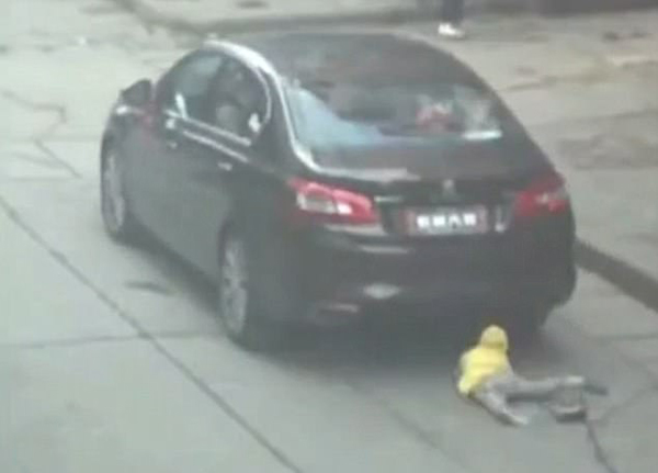 Khi bé gái băng qua đường, cô bé đã bị một chiếc xe hơi đâm phải và ngã ra đường. May mắn sau khi chiếc xe đi qua bé gái vẫn có thể ngồi dậy được.