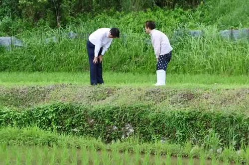 Ông Shinzo Abe cúi đầu chào một nông dân khi đi thăm đồng ruộng. Hai tay ông chạm đầu gối, đầu ông cúi xuống thấp hơn người nông dân.