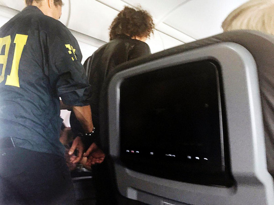 Anil Uskanil, 25 tuổi, bị cảnh sát dẫn đi sau khi gây rối trên máy bay. Ảnh: AP