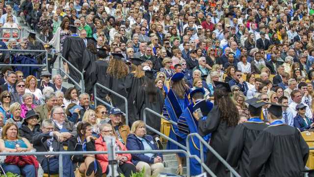 Các sinh viên lần lượt bỏ về khi ông Pence đang phát biểu tại lễ tốt nghiệp (Ảnh: WSJ)