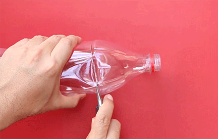 - Trước tiên, bạn dùng dao rọc giấy để cắt phần đầu của chiếc chai nhựa ra nhé.