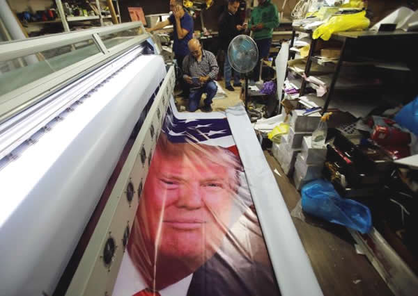 Người Palestine chuẩn bị áp phích chờ đón Tổng thống Donald Trump. Ảnh: Reuters