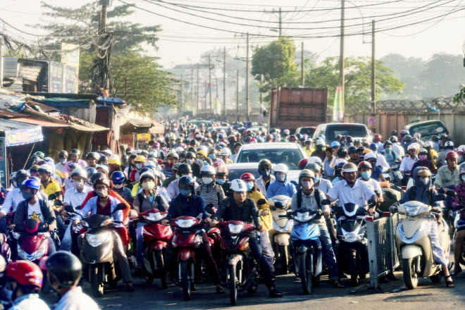 Ô tô và xe máy chen lấn nhau trên đoạn đường đông nghịt ở Campuchia. Nhiều người phải đeo khẩu trang để tránh khí thải từ các phương tiện.