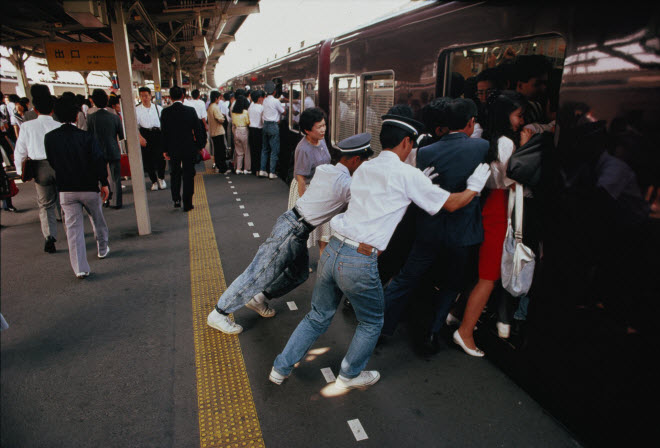 Nhân viên nhà ga Honshu ở Tokyo, Nhật Bản, đẩy hành khách lên đoàn tàu đông đúc.