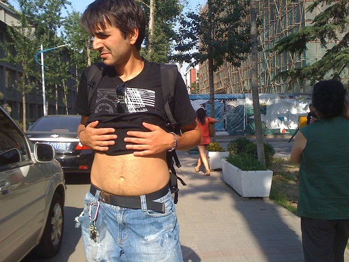 Nhiều đàn ông bản địa cho rằng vén áo khi trời nóng có lợi cho sức khỏe của họ. Tuy nhiên, bác sĩ Yan Zheng khẳng định điều này không hề liên quan. “Mọi người khoe bụng vì họ cảm thấy quá nóng, tuy nhiên họ không đủ can đảm để cởi trần”, Yan nói. Ảnh: Beijinger.