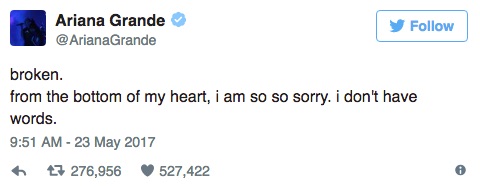 Ca sỹ Ariana cho biết trên Twitter rằng cô cảm thấy “tan nát”, và “từ tận đáy lòng, tôi rất lấy làm tiếc. Tôi không biết phải nói sao.”