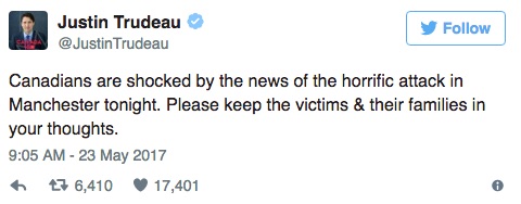 Thủ tướng Canada Justin Trudeau viết trên tài khoản Twitter của ông: “Người Canada bị sốc khi biết tin về cuộc tấn công khủng khiếp ở Manchester tối nay. Xin hãy tưởng nhớ các nạn nhân và gia đình của họ.”
