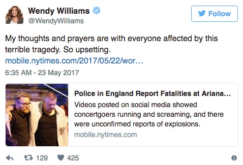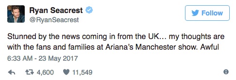 MC nổi tiếng Ryan Seacrest viết trên Twitter: “Sững sờ trước tin từ Anh Quốc… tâm tưởng của tôi hướng tới những người hâm mộ và gia đình [các nạn nhân] tại buổi biểu diễn của Ariana ở Manchester. Thật tồi tệ.”