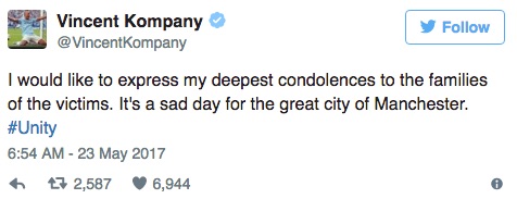 “Tôi xin bày tỏ lời chia buồn sâu sắc nhất đến các gia đình nạn nhân. Đó là một ngày buồn cho thành phố lớn của Manchester”, anh viết trên Twitter kèm dòng tag #Unity (đoàn kết).