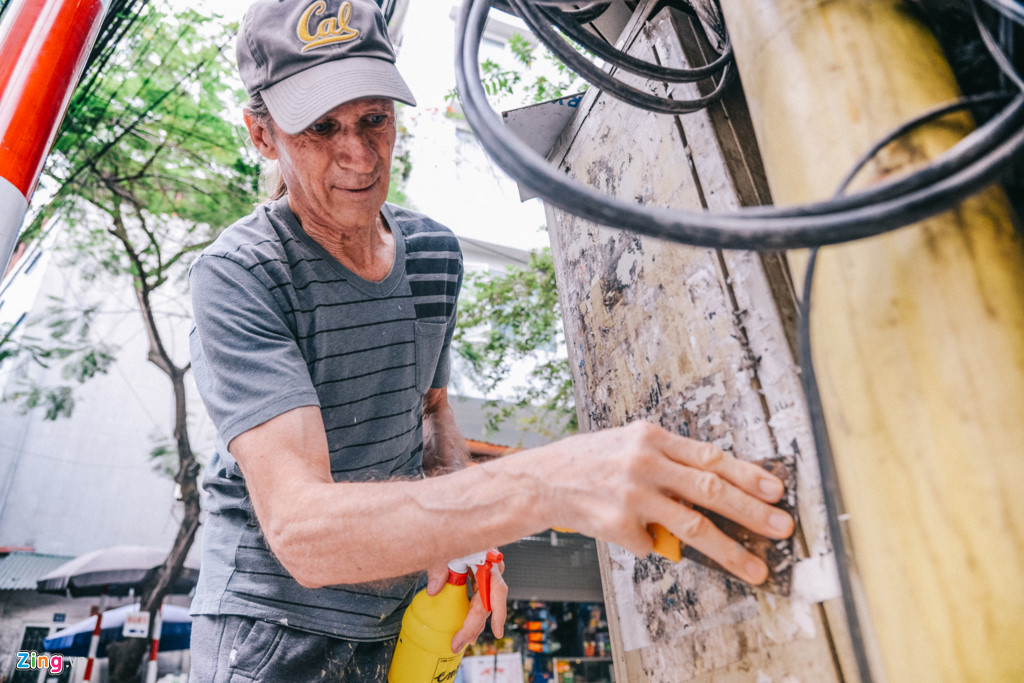 Gần một tháng nay, vào mỗi buổi chiều, người dân tại ngõ 219 Nguyễn Ngọc Vũ (Cầu Giấy, Hà Nội) từ lạ lẫm đã dần quen vơi hình ảnh một ông Tây tất bật cùng nhóm bạn trẻ gỡ bỏ quảng cáo, rao vặt trên các cột điện, bờ tường.