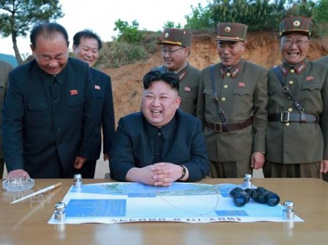 Nhà lãnh đạo Triều Tiên Kim Jong -un tươi cười với ông Ri Pyong Chol (bên trái, hàng trước), ông Kim Jong Sik (giữa, hàng sau) và ông Jang Chang Ha ( thứ 2 bên phải sang), sau vụ thử thành công tên lửa đạn đạo.