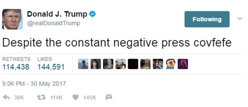 Một từ lạ mà ông Trump viết trên Twitter thu hút đông đảo người dùng mạng là từ "covfefe". Mọi người cố tìm cách tra mọi loại từ điển đều không có nghĩa của từ này. Tuy nhiên, Thư ký báo chí Nhà Trắng cho biết từ "covfefe" mà Tổng thống Mỹ Donald Trump viết trên Twitter thực tế có ý nghĩa với một nhóm người nhất định.