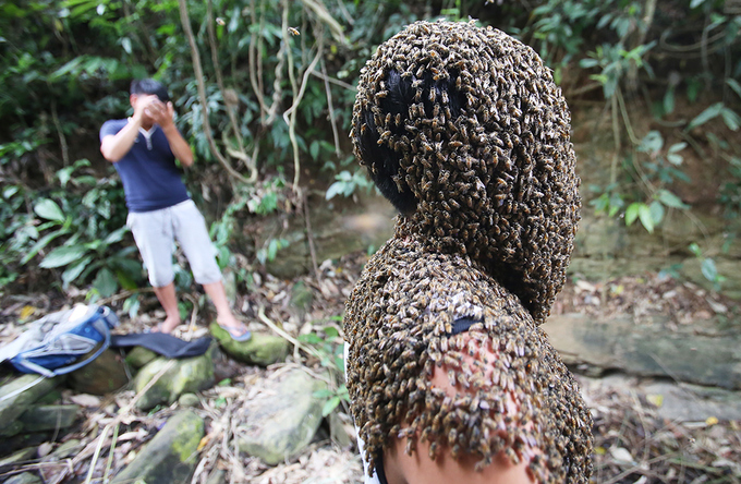 Đàn ong đậu kín nhưng "dị nhân" vẫn thoải mái di chuyển, nói chuyện.