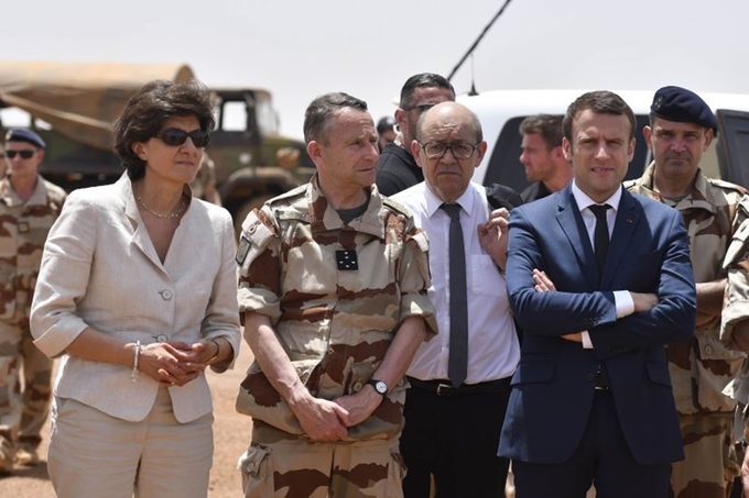 Trong ảnh, Tổng thống Pháp Macron (ngoài cùng bên phải), Ngoại trưởng Jean-Yves Le Drian (giữa) và Bộ trưởng Quốc pḥng Sylvie Goulard trong chuyến thăm binh sĩ Pháp đóng quân tại Mali tháng trước