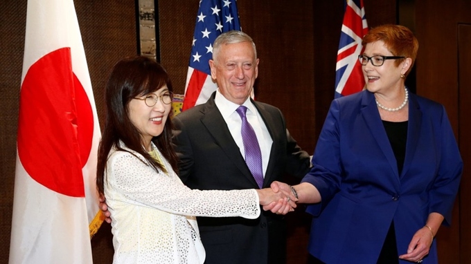 Bộ trưởng Quốc pḥng Australia Marise Payne gặp mặt người đồng cấp Nhật Bản Tomomi Inada và người đồng cấp Mỹ James Mattis bên lề Diễn đàn an ninh Đối thoại Shangri-La lần thứ 16.