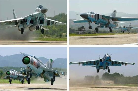 MiG-29 (trên, trái), MiG-23 (trên, phải), MiG-21 (dưới, trái) và Sukhoi Su-25 Frogfoot (dưới, phải) tham gia cuộc thi. (Ảnh: Rodong Sinmun)