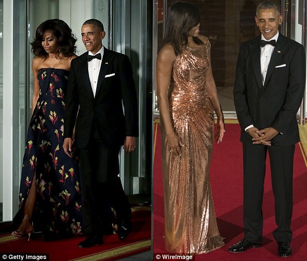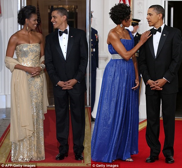 Bà Michelle cho rằng trong khi bà bị chú ý tới từng chiếc váy và phụ kiện thì ông Obama lại chẳng bị ai phát hiện ra bí mật trong cách ăn mặc của mình. Bức ảnh được chụp vào năm 2009 (trái) và năm 2010 (phải).