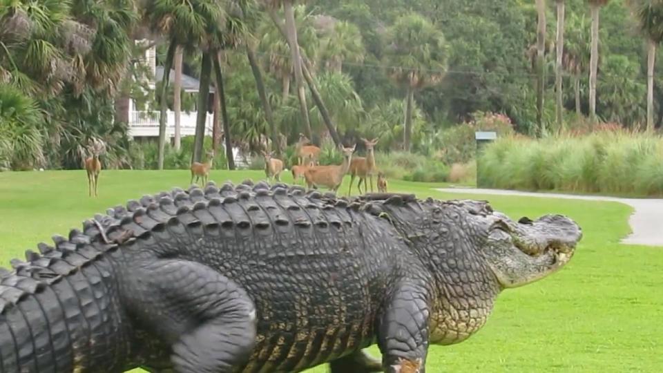 Cá sấu khổng lồ huyền thoại bất ngờ xuất hiện từ một cái ao ở sân gold Ocean Creek, bang South Carolina và bình thản dạo chơi trên bãi cỏ.