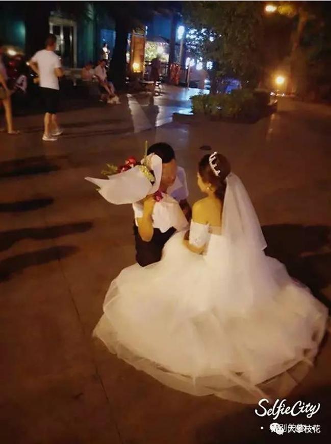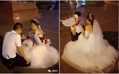 Vì không muốn người yêu xấu hổ, cô gái đã quyết định mặc một chiếc váy cưới trắng muốt rồi ngỏ lời cầu hôn ở một quảng trường trung tâm thành phố vào lúc 10 giờ tối - thời điểm đã vãn người qua lại.