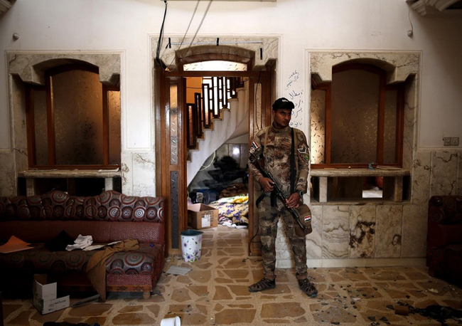 Một binh lính quân đội Iraq kiểm tra căn phòng nơi giam giữ các nữ tù nhân của IS.