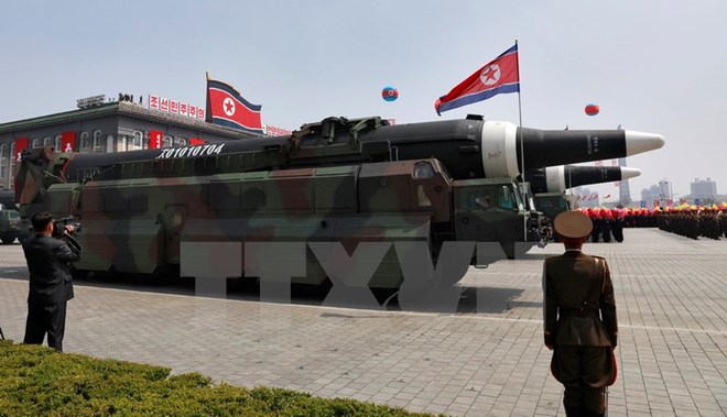 Các tên lửa của Triều Tiên được giới thiệu trong lễ duyệt binh kỷ niệm 105 năm ngày sinh cố Chủ tịch Kim Nhật Thành ở thủ đô Bình Nhưỡng ngày 15/4. (Nguồn: EPA/TTXVN)