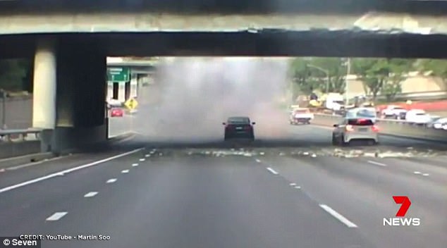 Vì chiều cao quá khổ, xe tải đâm sầm vào cầu, khiến mảnh vụn bay khắp nơi. Chiếc ô tô đi phía sau phủ kín trong bụi mù buộc phải phanh gấp giữa đường.