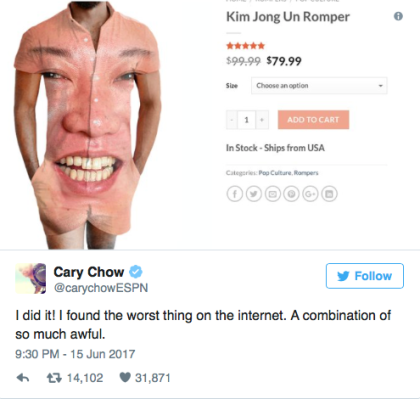 Trên Twitter ngày hôm qua, Cary Chow - MC của ESPN đã đăng tải 1 hình ảnh "ngộ nghĩnh" được cho là 1 thiết kế mới dành cho nam giới có tên "Yếm Kim Jong Un" được bán với giá 79,99$ trên 1 website bán hàng online. Dòng trạng thái như sau "Tôi đã thấy nó trên internet, 1 sự kết hợp kinh khủng"