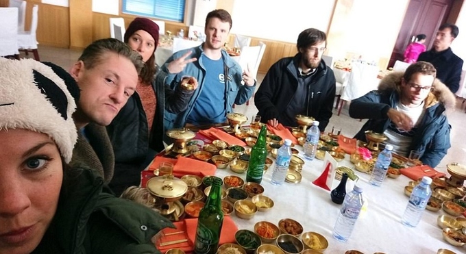 Sinh viên Mỹ chụp ảnh kỷ niệm với ba phụ nữ mặc trang phục truyền thống Triều Tiên trong một ngày tuyết rơi ở Bình Nhưỡng.