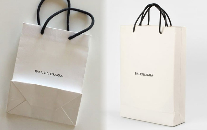 Nếu để ý kỹ hơn bạn sẽ thấy chiếc túi miễn phí chỉ được làm bằng giấy thông thường trong khi túi hiệu Balenciaga có chất liệu là da bò, phom dáng thì cứng cáp, trông "chất" hơn.