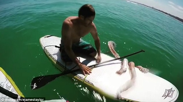 James thả dây thừng xuống để giúp con mực. Nhưng thay vì bám vào dây, con vật quyết định dùng xúc tu bám vào ván của người đàn ông đang lướt sóng ngoài khơi cùng vợ.