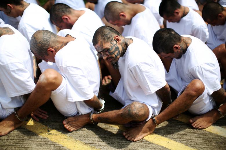 Thành viên MS-13 ngồi xếp thành hàng dưới đất, tay còng ra sau, mặt cúi gằm. Một số tên tội phạm còn xăm chữ MS nhìn thấy rõ trên đầu.