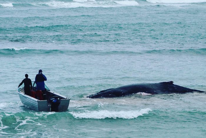Để cứu cá voi, lực lượng cứu hộ đã điều thuyền nhỏ cùng hai nhân viên cứu hộ ra trợ giúp. Họ mặc đồ lặn để đổ nước lên con vật đang chảy máu, nhằm giữ cho nó luôn ướt.